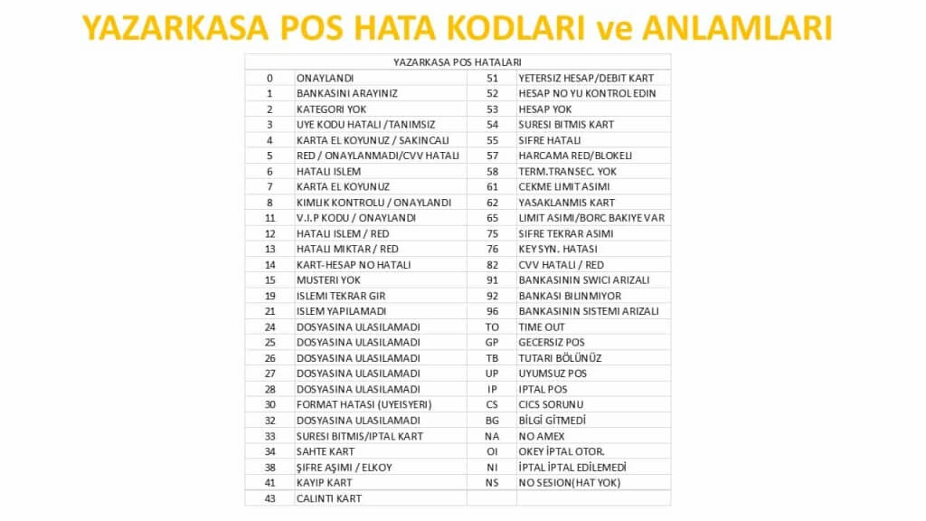 Pos cihazı hata kodları